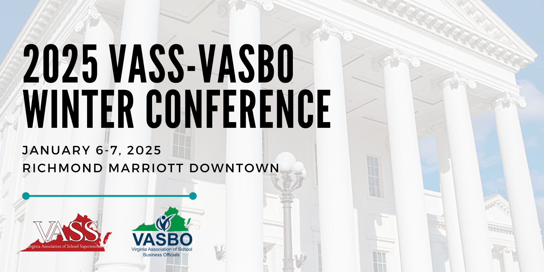 Join us for the 2025 VASS-VASBO Winter Conference! This year's conference will feature a host of presenters and panelists to discuss emerging issues and hot topics in school business. This year's program will entail an overview of what to expect from the 2025 General Assembly session, an update from the Virginia Retirement System, time for networking, and much more! Additionally, VASS and VASBO partners will be on-site for informal networking and to discuss the latest in school business products and services.