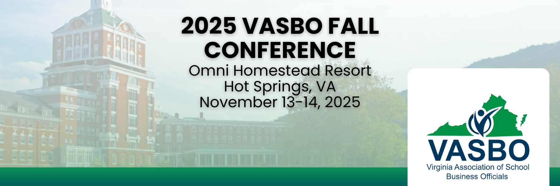Join us for the 2025 VASBO Fall Conference, November 13-14 at the Omni Homestead in Hot Springs! This year's conference will feature a great lineup of speakers to address the most pressing issues in school business and provide ideas to assist you daily. Additionally, our VASBO partners will be on-site for informal networking and to discuss the latest in school business products and services.